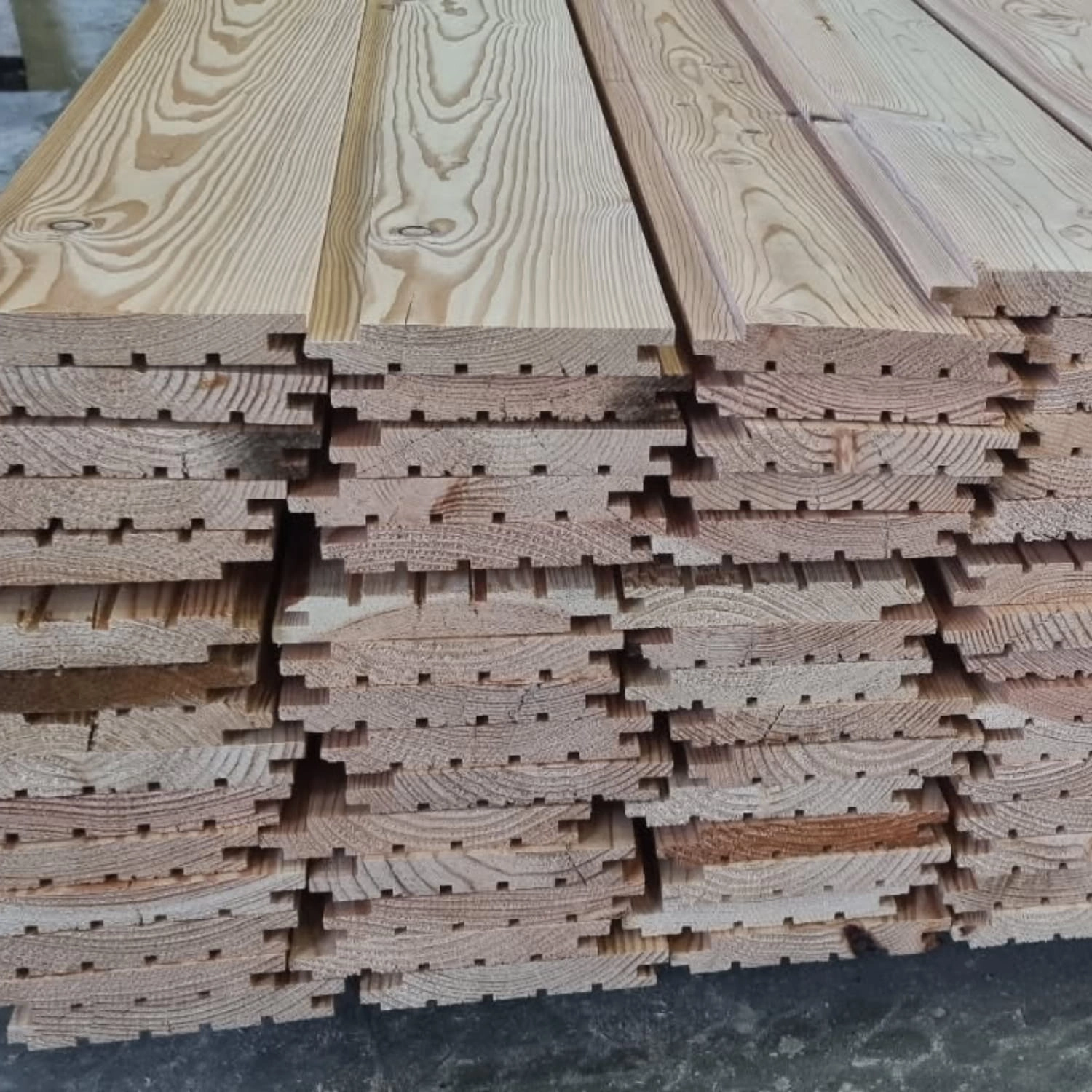 Deski wykonane z modrzewia europejskiego łączą w sobie wyjątkową estetykę naturalnego drewna z wysoką trwałością. Modrzew to jeden z najbardziej odpornych gatunków drewna. Doskonale znosi warunki zewnętrzne, wilgoć i zmienne temperatury, zachowując przy tym elegancki wygląd przez długie lata. Dzięki profilowi pióro-wpust deski idealnie do siebie przylegają, tworząc równą, estetyczną powierzchnię.