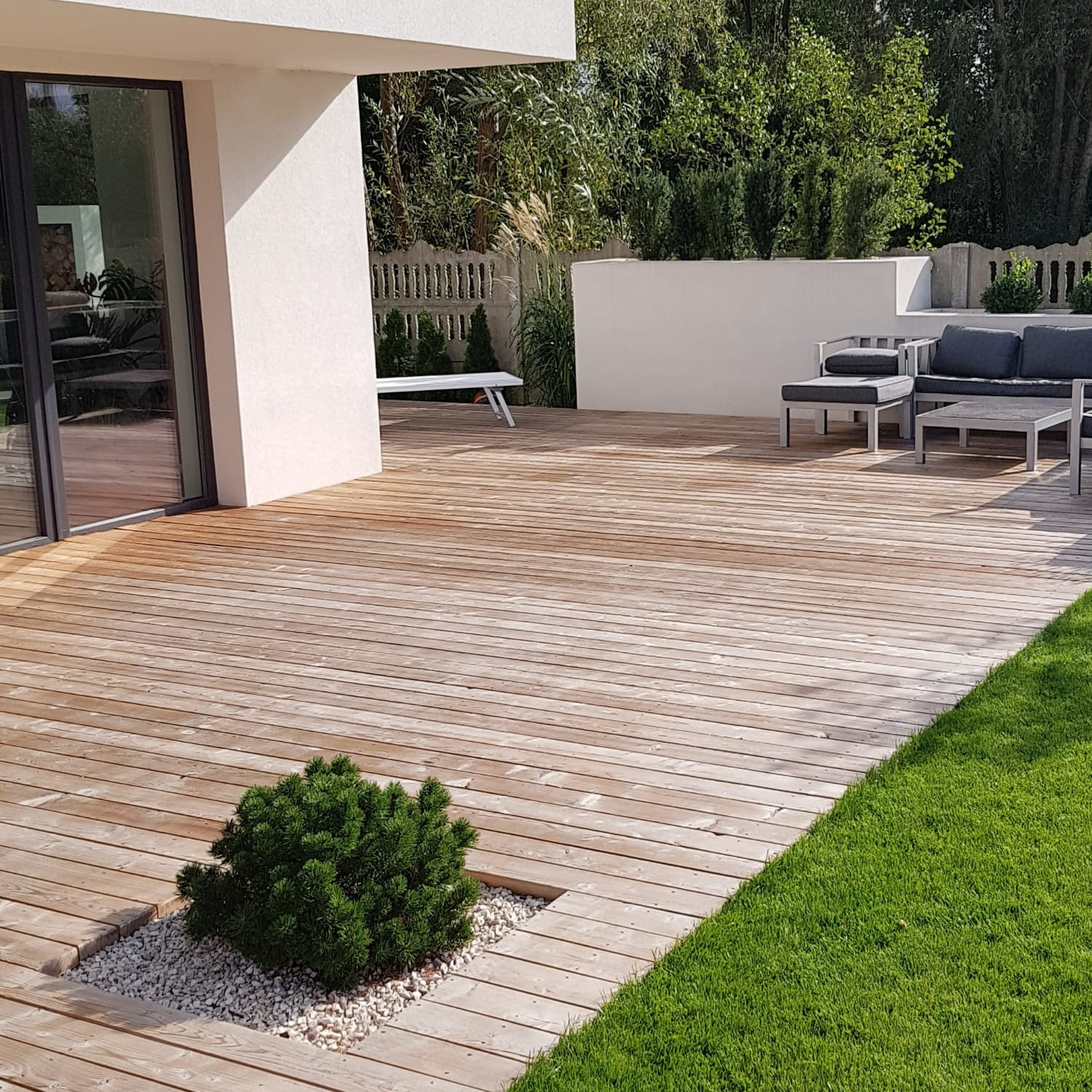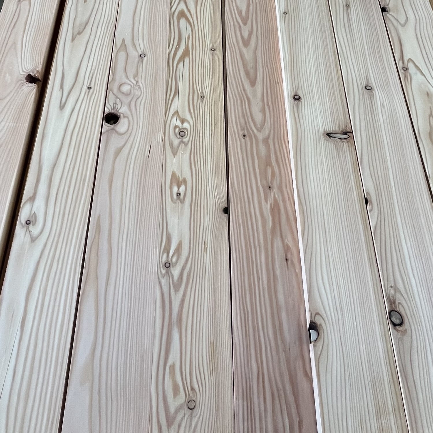 Deski wykonane są z modrzewia europejskiego, cenionego za swoją trwałość, odporność na wilgoć i piękne, naturalne usłojenie. To materiał, który łączy w sobie estetykę i wytrzymałość, idealny zarówno do zastosowań wewnętrznych, jak i zewnętrznych.