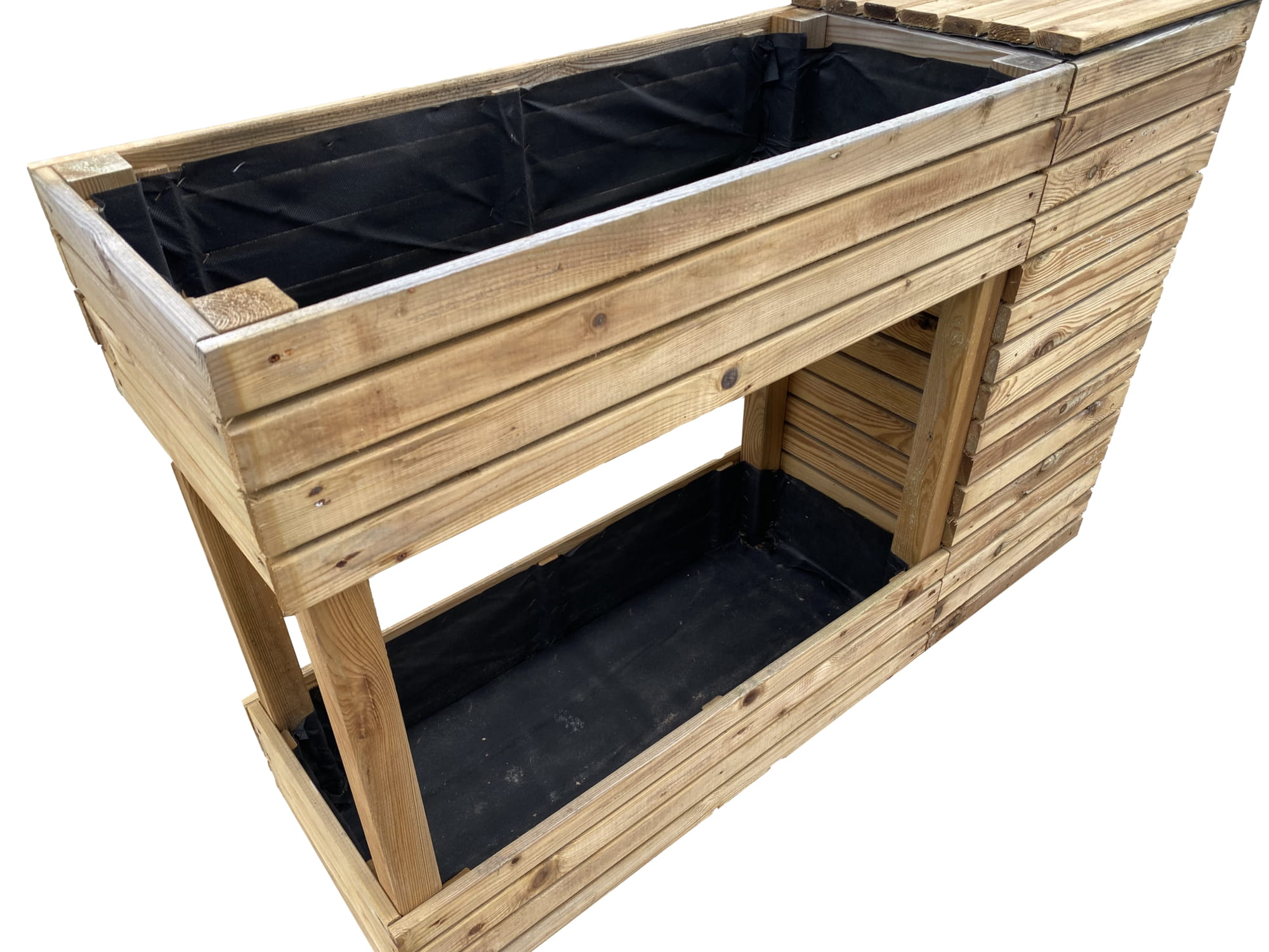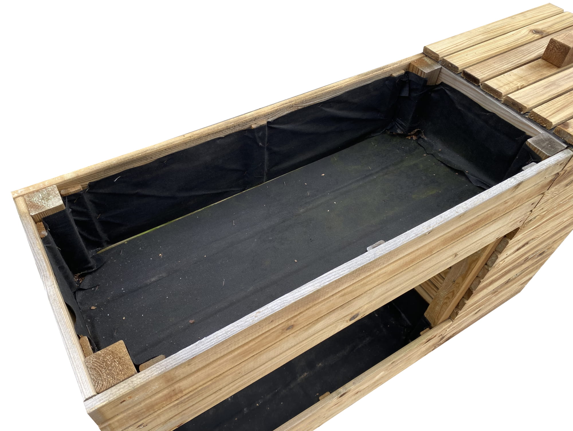 Warzywnik z dwoma grządkami i skrzynią do przechowywania narzędzi, idealny do uprawy owoców, warzyw, ziół i kwiatów na małym balkonie lub tarasie. Dwie duże grządki obite włókniną pozwalają na rozpoczęcie siewu od razu po uzupełnieniu ziemią. Skrzynia ogrodowa z pokrywą daje możliwość uporządkowania narzędzi, donic i nasion. Natomiast dodatkowo wydzielona cześć pod skrzynią pozwala schować np. worek ziemi.